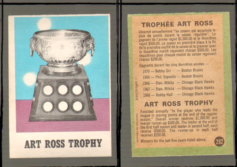 ITEM# : CS10047244 1970-71 O-PEE-CHEE CARD #262 ART ROSS TROPHY DESCRIPTION 1970-71 O-PEE-CHEE CARD #262 ART ROSS TROPHY CONDITION VG/EX 1 LIGHT SURFACE CREASE PRICE $3.99 USD SHIPPING CANADA RESIDENT $3.00