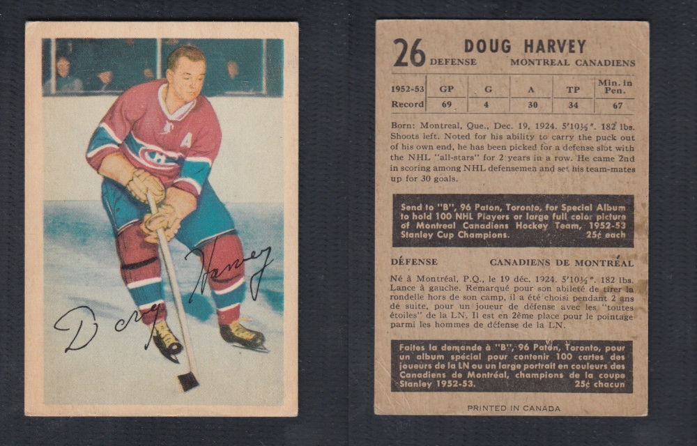 ITEM# : CS12440204 1953-54 PARKHURST HOCKEY CARD #26 D. HARVEY DESCRIPTION 1953-54 PARKHURST HOCKEY CARD #26 D. HARVEY CONDITION VG 1 CORNER CREASE PRICE $59.99 USD SHIPPING CANADA RESIDENT 3.00$