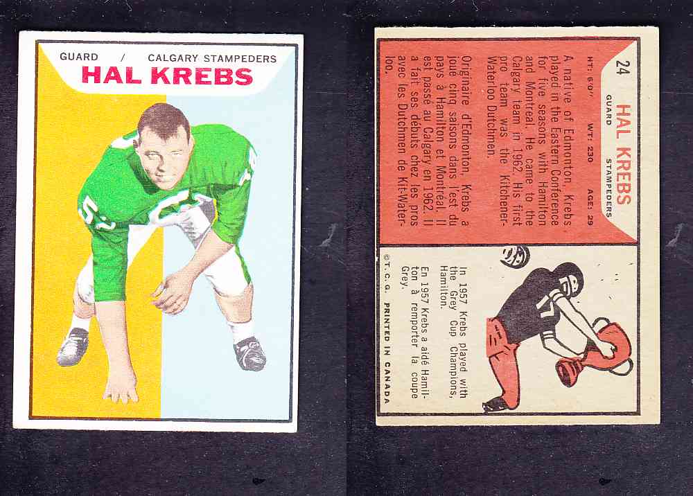 ITEM# : CS16851326 1965 CFL TOPPS FOOTBALL CARD #24 H. KREBS DESCRIPTION 1965 CFL TOPPS FOOTBALL CARD #24 H. KREBS CONDITION EX+ NO CREASE PRICE $4.99 USD SHIPPING CANADA RESIDENT $3.00