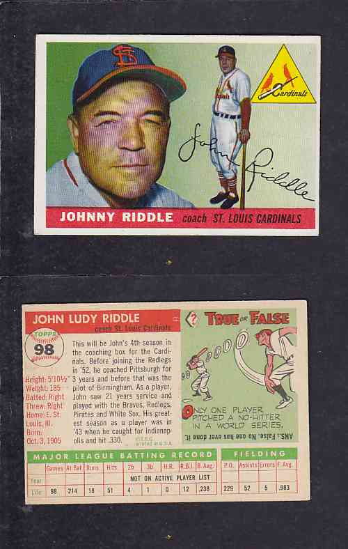 ITEM# : CS17442379 1955 TOPPS BASEBALL CARD #98 J. RIDDLE DESCRIPTION 1955 TOPPS BASEBALL CARD #98 J. RIDDLE CONDITION EX/MINT NO CREASE PRICE $7.99 USD SHIPPING CANADA RESIDENT $$3.00