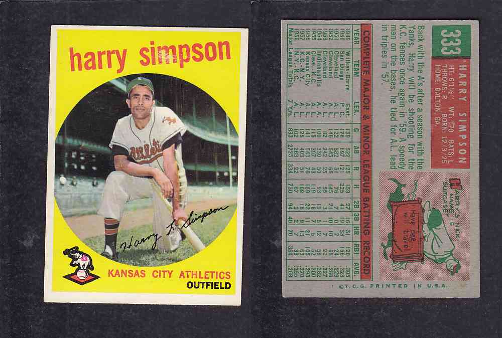 ITEM# : CS19444015 1959 TOPPS BASEBALL CARD #333 H. SIMPSON DESCRIPTION 1959 TOPPS BASEBALL CARD #333 H. SIMPSON CONDITION EX+ NO CREASE PRICE $2.99 USD SHIPPING CANADA RESIDENT $3