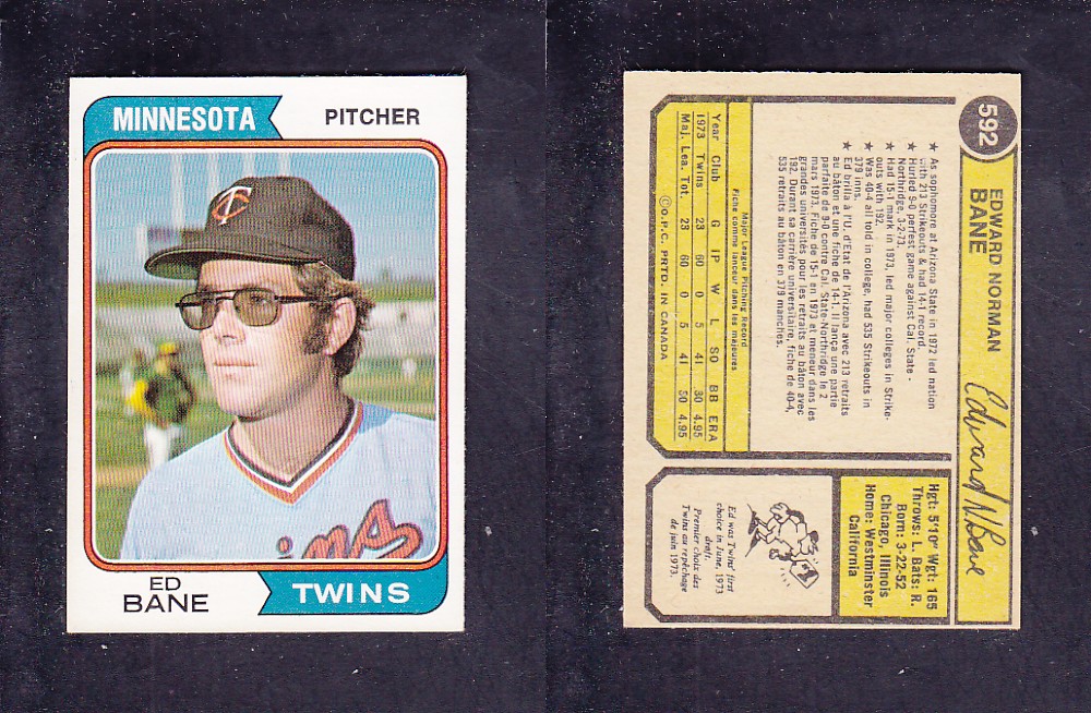 ITEM# : CS19533625 1974 O-PEE-CHEE BASEBALL CARD #592 E. BANE DESCRIPTION 1974 O-PEE-CHEE BASEBALL CARD #592 E. BANE CONDITION NRMINT NO CREASE PRICE $3.99 USD SHIPPING CANADA RESIDENT 3.00$