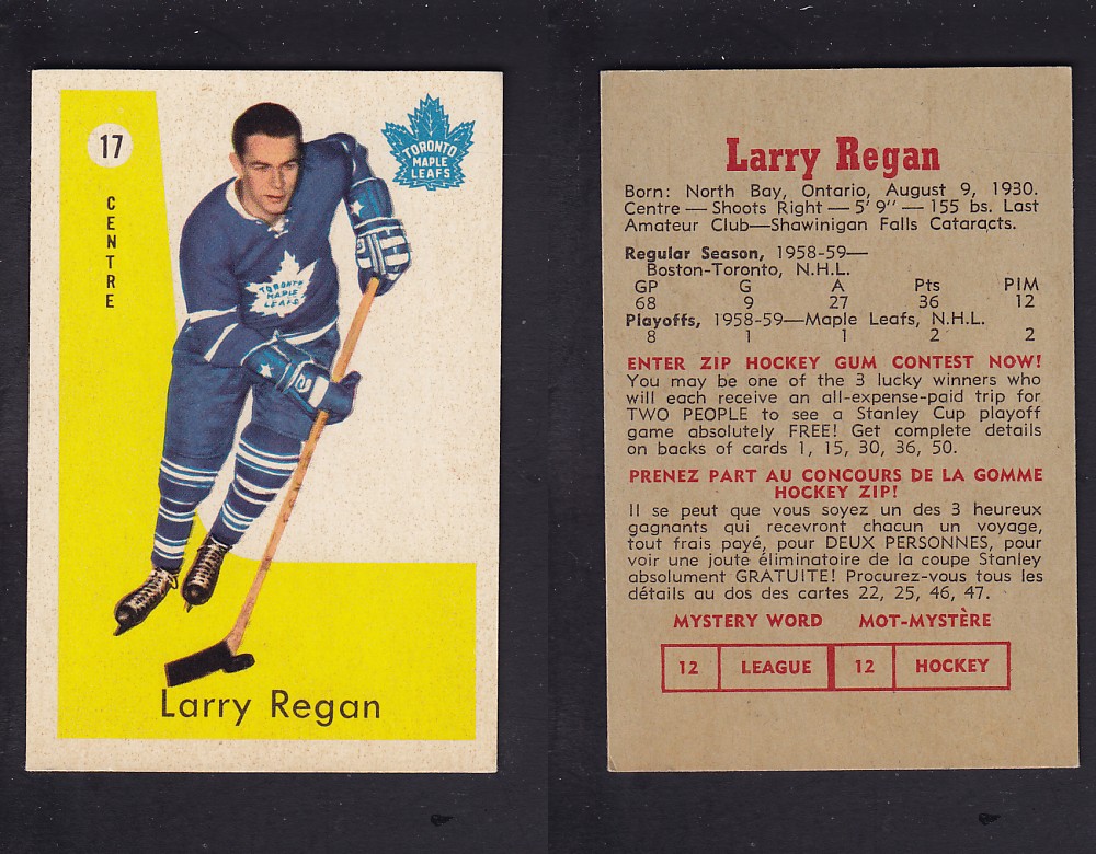 ITEM# : CS19715456 1959-60 PARKHURST HOCKEY CARD #17 L. REGAN DESCRIPTION 1959-60 PARKHURST HOCKEY CARD #17 L. REGAN CONDITION EX/MINT NO CREASE PRICE $19.99 USD SHIPPING CANADA RESIDENT $3.00