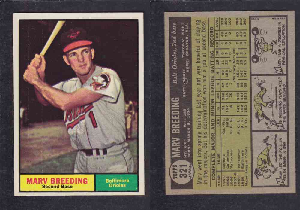ITEM# : CS20366456 1961 TOPPS BASEBALL CARD #321 M. BREEDING DESCRIPTION 1961 TOPPS BASEBALL CARD #321 M. BREEDING CONDITION NRMINT NO CREASE PRICE $2.99 USD SHIPPING CANADA RESIDENT 3.00$