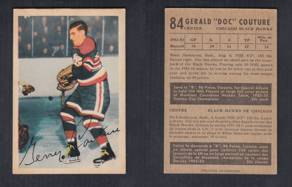 ITEM# : CS21102262 1953-54 PARKHURST HOCKEY CARD #84 G. COUTURE DESCRIPTION 1953-54 PARKHURST HOCKEY CARD #84 G. COUTURE CONDITION EX NO CREASE PRICE $19.99 USD SHIPPING CANADA RESIDENT 3.00$