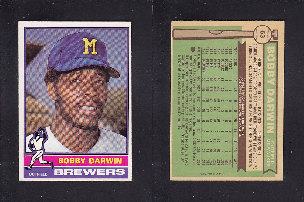 ITEM# : CS21431512 1976 O-PEE-CHEE BASEBALL CARD #63 B. DARWIN DESCRIPTION 1976 O-PEE-CHEE BASEBALL CARD #63 B. DARWIN CONDITION NRMINT NO CREASE PRICE $2.99 USD SHIPPING CANADA RESIDENT 3.00$