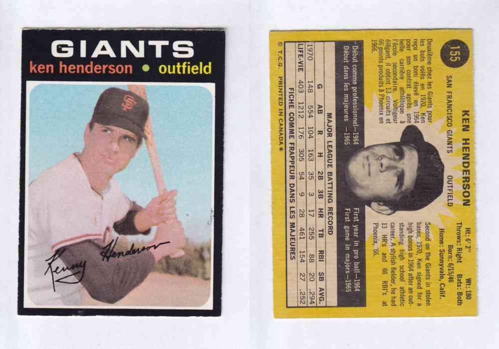 ITEM# : CS23518836 1971 O-PEE-CHEE BASEBALL CARDS #155 K. HENDERSON DESCRIPTION 1971 O-PEE-CHEE BASEBALL CARDS #155 K. HENDERSON CONDITION EX+ NO CREASE PRICE $2.99 USD SHIPPING CANADA RESIDENT 3.00$