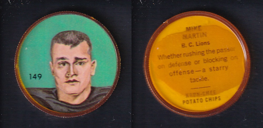ITEM# : CS23914430 1963 CFL NALLEY'S FOOTBALL COIN #149 M. MARTIN DESCRIPTION 1963 CFL NALLEY'S FOOTBALL COIN #148 B. MUNSEY CONDITION NR MINT PRICE $5.99 USD SHIPPING CANADA RESIDENT 3.00$