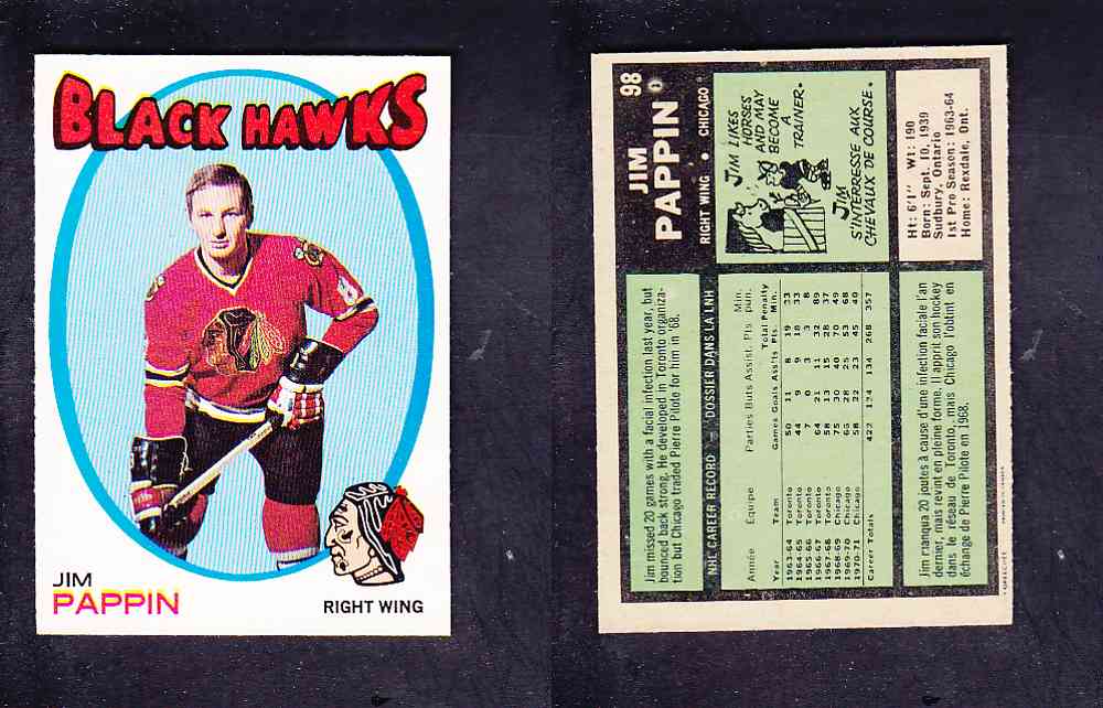 ITEM# : CS24234364 1971-72 O-PEE-CHEE HOCKEY CARD #98 J. PAPPIN DESCRIPTION 1971-72 O-PEE-CHEE HOCKEY CARD #98 J. PAPPIN CONDITION VG 1 SMALL CORNER CREASE PRICE $4.99 USD SHIPPING CANADA RESIDENT $3.00