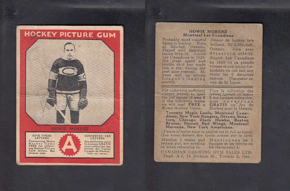 ITEM# : CS24397253 1933-34 CANADIAN CHEWING GUM HOCKEY CARD H. MORENZ DESCRIPTION 1933-34 CANADIAN CHEWING GUM HOCKEY CARD H. MORENZ CONDITION GOOD PRICE $499.99 USD SHIPPING CANADA RESIDENT 3.00$