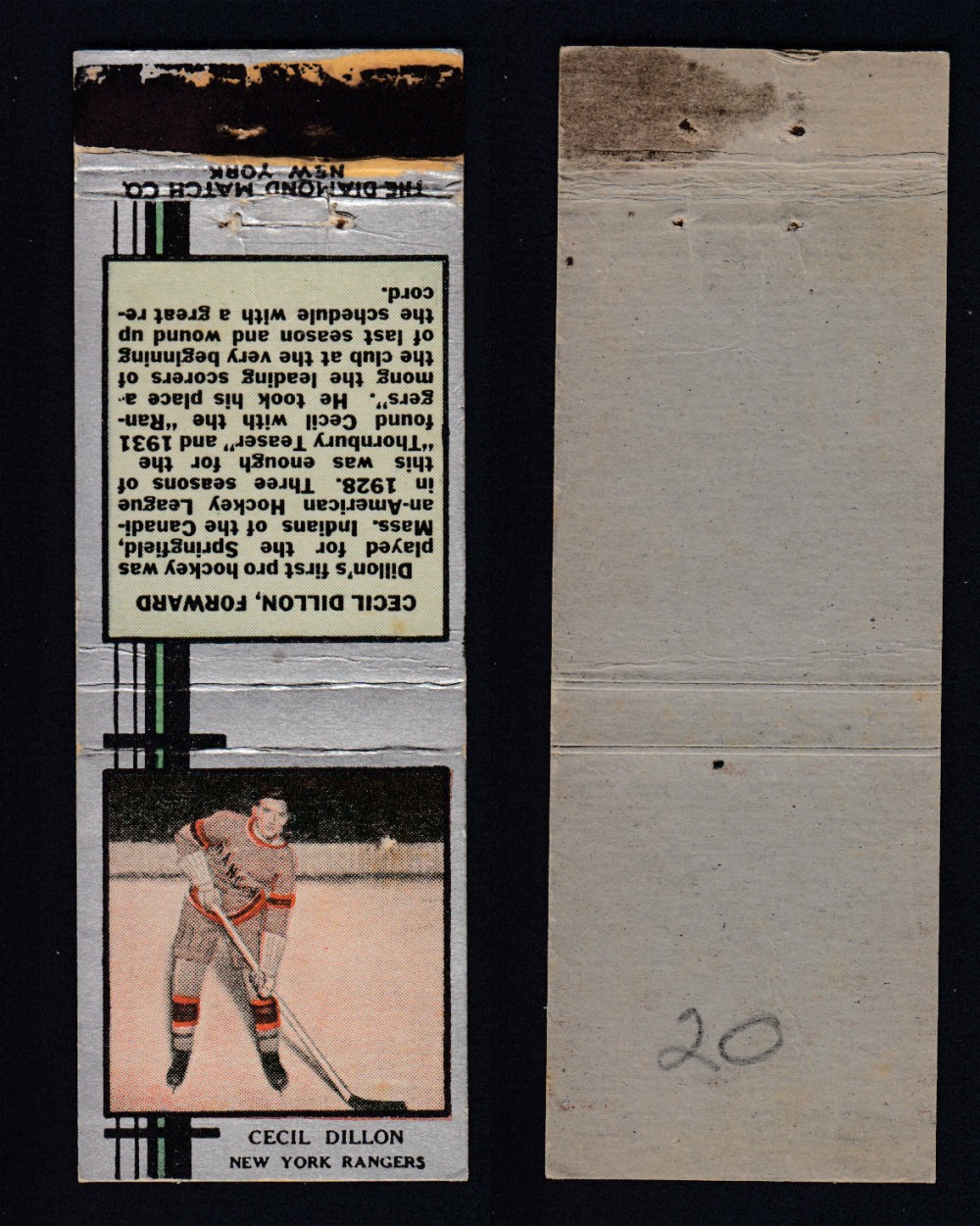 ITEM# : CS24893408 1933-34 DIAMOND MATCHBOOK HOCKEY CARD SILVER C. DILLON DESCRIPTION 1933-34 DIAMOND MATCHBOOK HOCKEY CARD SILVER C. DILLON CONDITION EX+
