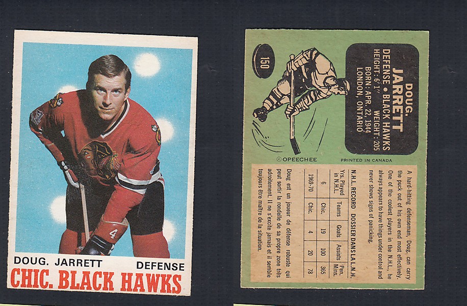 ITEM# : CS26114405 1970-71 O-PEE-CHEE HOCKEY CARD #150 D. JARRETT DESCRIPTION 1970-71 O-PEE-CHEE HOCKEY CARD #150 D. JARRETT CONDITION EX/MINT NO CREASE PRICE $4.99 USD SHIPPING CANADA RESIDENT 3.00$