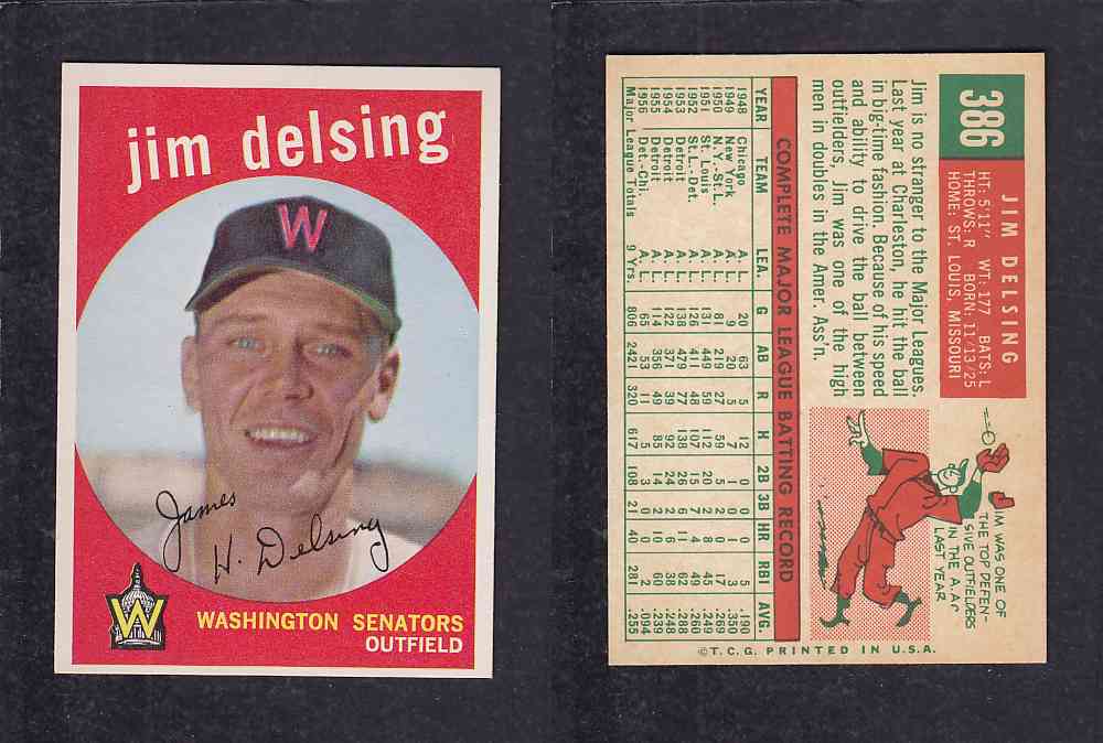 ITEM# : CS27545554 1959 TOPPS BASEBALL CARD #386 J. DELSING DESCRIPTION 1959 TOPPS BASEBALL CARD #386 J. DELSING CONDITION NRMINT NO CREASE PRICE $2.99 USD SHIPPING CANADA RESIDENT $3