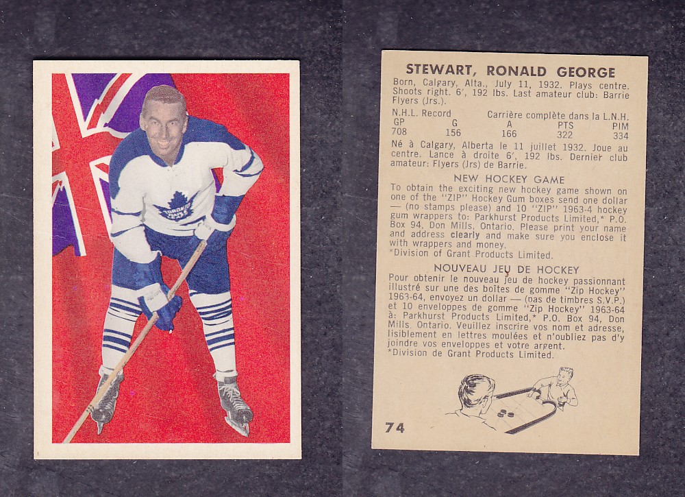 ITEM# : CS28636159 1963-64 PARKHURST HOCKEY CARD #74 R. STEWART DESCRIPTION 1963-64 PARKHURST HOCKEY CARD #74 R. STEWART CONDITION EX/MINT NO CREASE PRICE $9.99 USD SHIPPING CANADA RESIDENT 3.00$