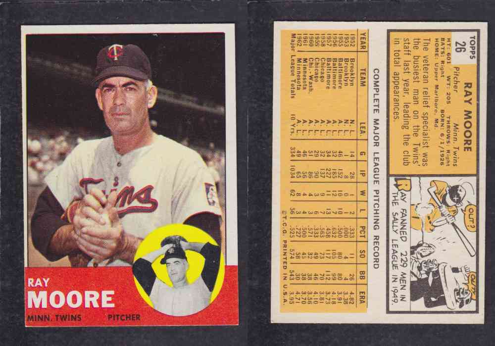ITEM# : CS31699220 1963 TOPPS BASEBALL CARD #26 R. MOORE DESCRIPTION 1963 TOPPS BASEBALL CARD #26 R. MOORE CONDITION NRMINT NO CREASE PRICE $2.99 USD SHIPPING CANADA RESIDENT 3.00$