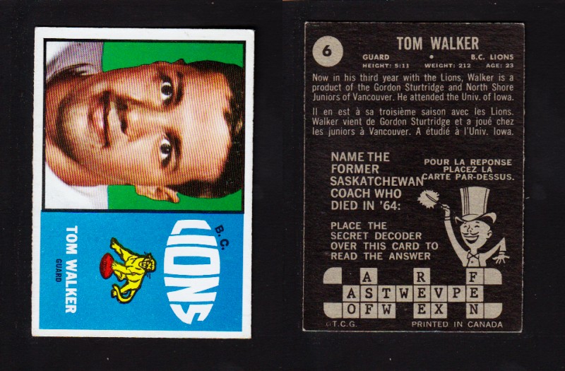 1964 CFL TOPPS FOOTBALL CARD #6 T. WALKER