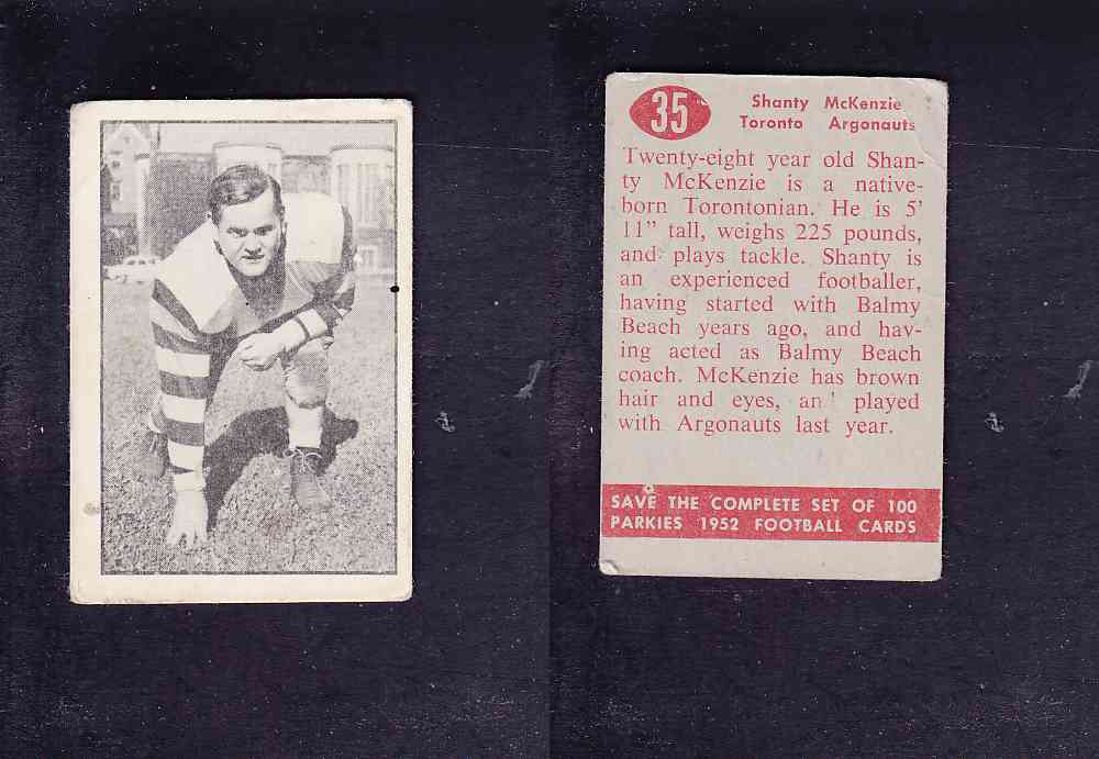 ITEM# : CS33499342 1952 CFL PARKHURST FOOTBALL CARD #35 S. MCKENZIE DESCRIPTION 1952 CFL PARKHURST FOOTBALL CARD #35 S. MCKENZIE CONDITION VG 1 CORNER CREASE PRICE $9.99 USD SHIPPING CANADA RESIDENT $3.00