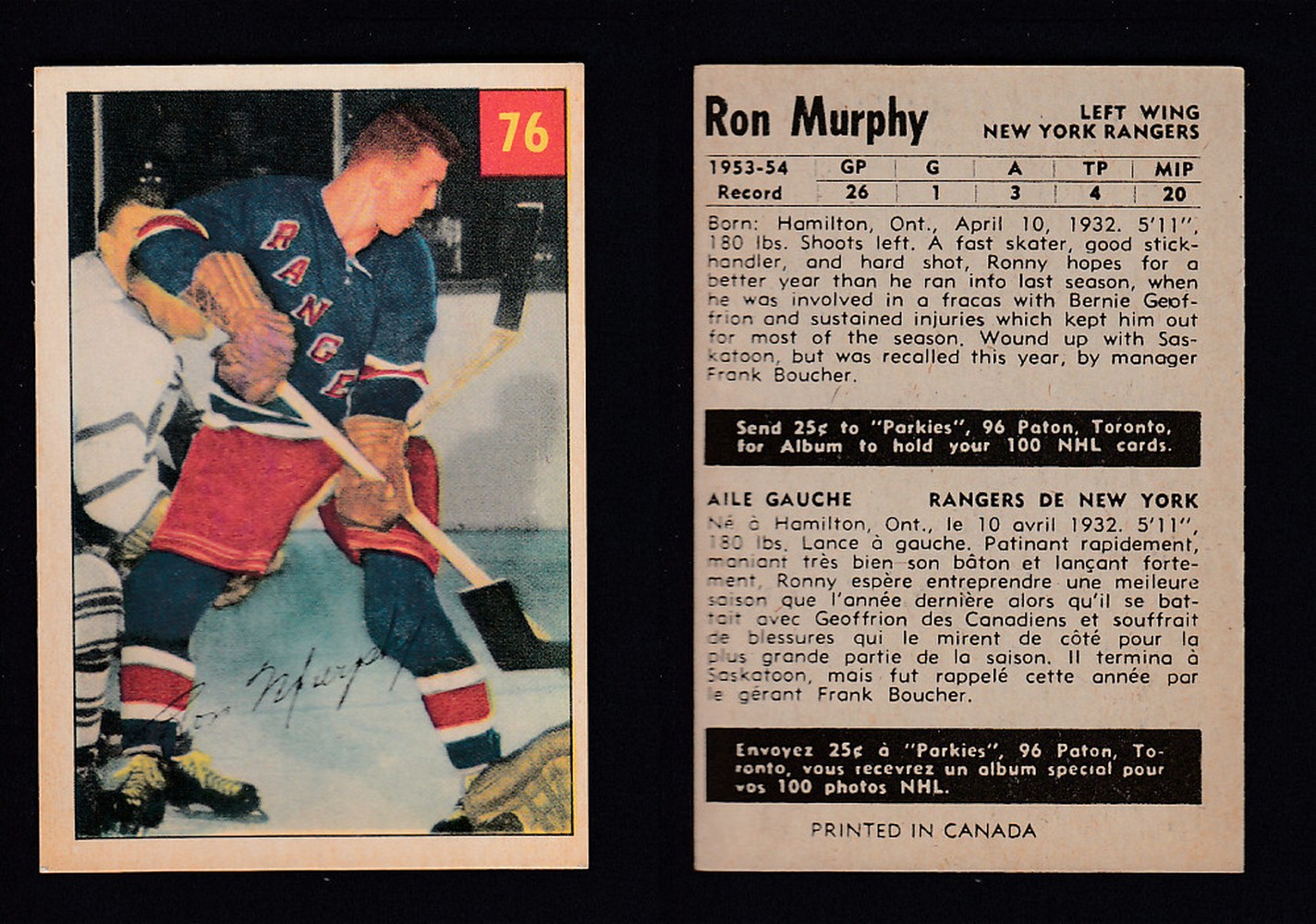 ITEM# : CS35538082 1954-55 PARKHURST HOCKEY CARD #76 R. MURPHY DESCRIPTION 1954-55 PARKHURST HOCKEY CARD #76 R. MURPHY CONDITION NRMINT NO CREASE PRICE $24.99 USD SHIPPING CANADA RESIDENT 3.00$