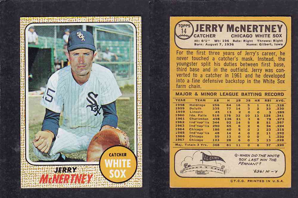 ITEM# : CS35577324 1968 TOPPS BASEBALL CARD #14 J. McNERTNEY DESCRIPTION 1968 TOPPS BASEBALL CARD #14 J. McNERTNEY CONDITION EX+ NO CREASE PRICE $1.99 USD SHIPPING CANADA RESIDENT 3.00$