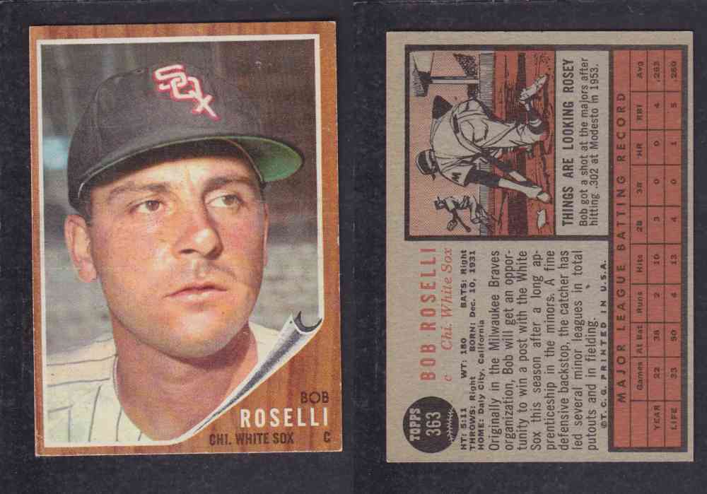 ITEM# : CS36166415 1962 TOPPS BASEBALL CARD #363 B. ROSELLI DESCRIPTION 1962 TOPPS BASEBALL CARD #363 B. ROSELLI CONDITION EX+ NO CREASE PRICE $1.99 USD SHIPPING CANADA RESIDENT 3.00$