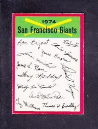 ITEM# : CS36607954 1974 O-PEE-CHEE BASEBALL CARD TEAM CHECKLIST SAN FRANCISCO GIANTS DESCRIPTION 1974 O-PEE-CHEE BASEBALL CARD TEAM CHECKLIST SAN FRANCISCO GIANTS CONDITION EX/MINT NO CREASE PRICE $2.99 USD SHIPPING CANADA RESIDENT 3.00$