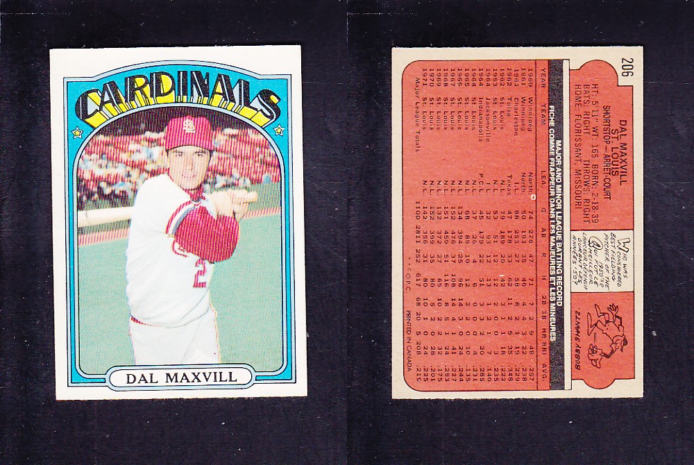 ITEM# : CS37275484 1972 O-PEE-CHEE BASEBALL CARD #206 D. MAXVILL DESCRIPTION 1972 O-PEE-CHEE BASEBALL CARD #206 D. MAXVILL CONDITION NRMINT TO MINT NO CREASE PRICE $2.99 USD SHIPPING CANADA RESIDENT 3.00$