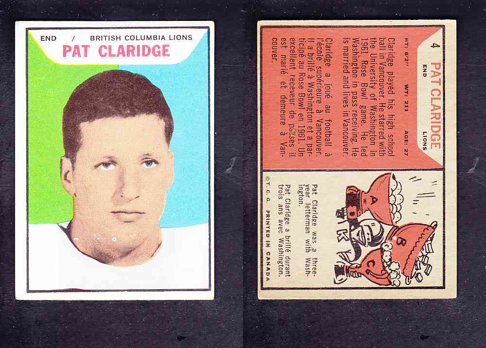 ITEM# : CS39078121 1965 CFL TOPPS FOOTBALL CARD #4 P.CLARIDGE DESCRIPTION 1965 CFL TOPPS FOOTBALL CARD #4 P. CLARIDGE CONDITION VG 1 STAPLE HOLE PRICE $4.99 USD SHIPPING CANADA RESIDENT $3.00