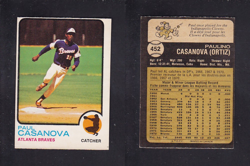 ITEM# : CS43492396 1973 O-PEE-CHEE BASEBALL CARD #452 P. CASANOVA DESCRIPTION 1973 O-PEE-CHEE BASEBALL CARD #452 P. CASANOVA CONDITION EX+ NO CREASE PRICE $2.99 USD SHIPPING CANADA RESIDENT 3.00$