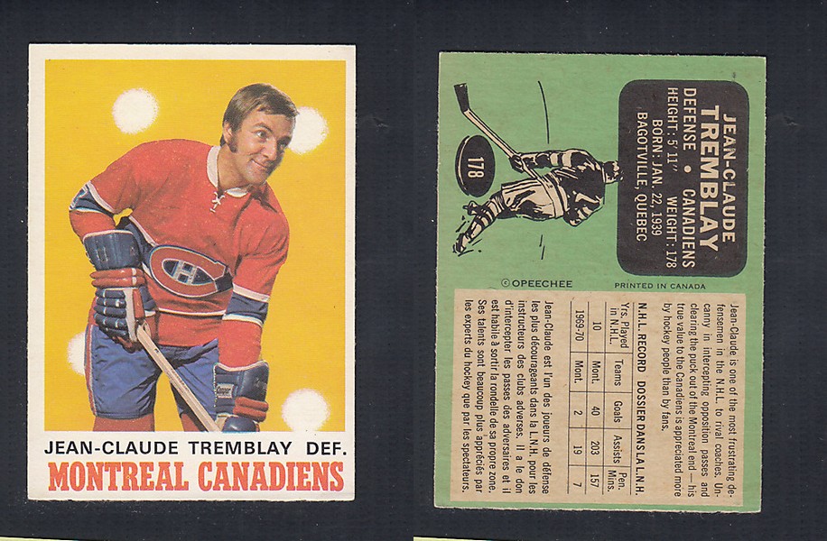 ITEM# : CS43635228 1970-71 O-PEE-CHEE HOCKEY CARD #178 J.C. TREMBLAY DESCRIPTION 1970-71 O-PEE-CHEE HOCKEY CARD #178 J.C. TREMBLAY CONDITION EX NO CREASE PRICE $2.99 USD SHIPPING CANADA RESIDENT 3.00$