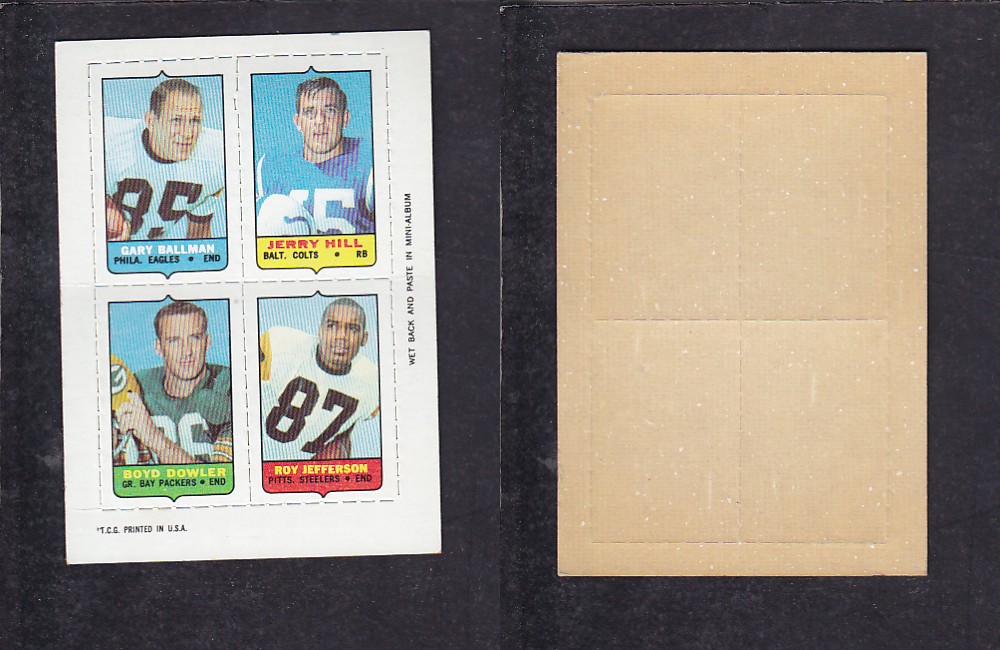 ITEM# : CS44153738 1969 NFL TOPPS FOOTBALL CARD 4 IN 1 INSERT G. BALLMAN DESCRIPTION 1969 NFL TOPPS FOOTBALL CARD 4 IN 1 INSERT G. BALLMAN CONDITION VG 1 CREASE PRICE $2.99 USD SHIPPING CANADA RESIDENT $3.00