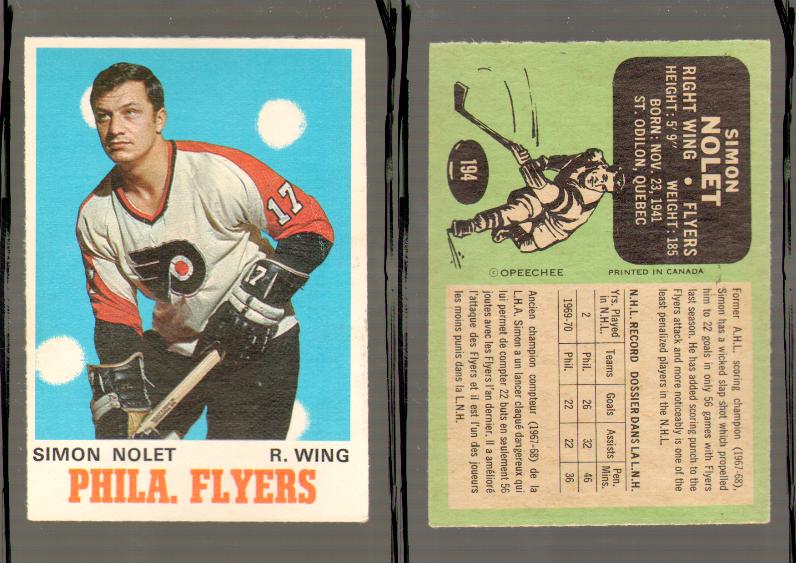 ITEM# : CS44737436 1970-71 O-PEE-CHEE CARD #194 S. NOLET DESCRIPTION 1970-71 O-PEE-CHEE CARD #194 S. NOLET CONDITION EX+ NO CREASE PRICE $3.99 USD SHIPPING CANADA RESIDENT $3.00