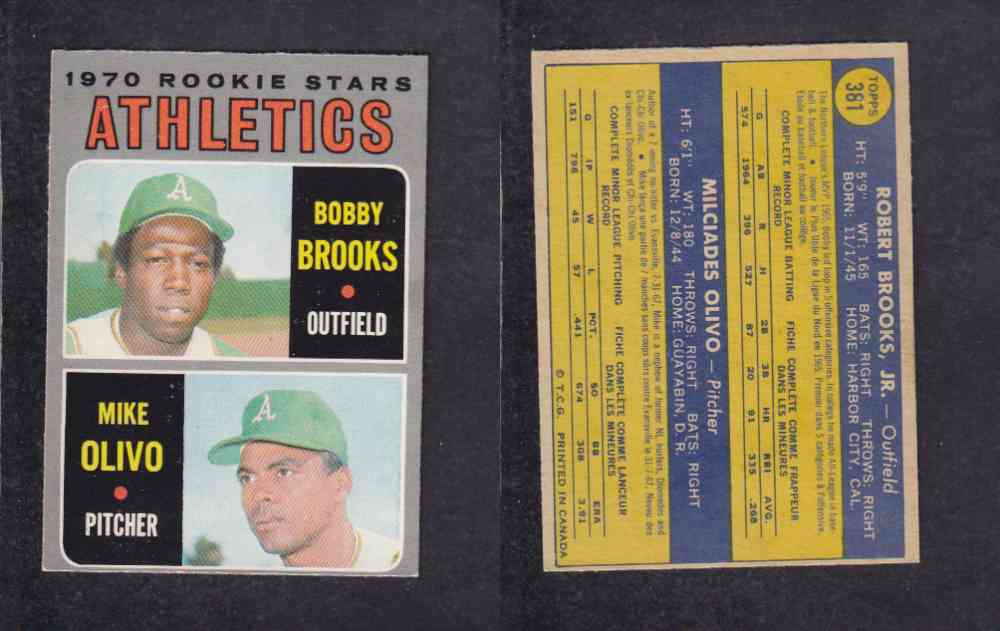 ITEM# : CS45604025 1970 O-PEE-CHEE BASEBALL CARD #381 ROOKIE STARS ATHLETICS DESCRIPTION 1970 O-PEE-CHEE BASEBALL CARD #381 ROOKIE STARS ATHLETICS CONDITION EX/MINT NO CREASE PRICE $1.99 USD SHIPPING CANADA RESIDENT 3.00$