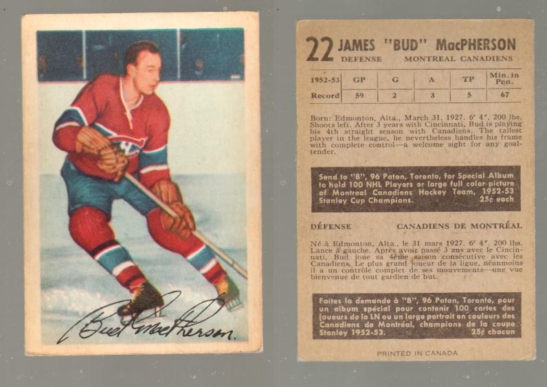 ITEM# : CS48474972 1953-54 PARKHURST HOCKEY CARD #22 J. MacPHERSON DESCRIPTION 1953-54 PARKHURST HOCKEY CARD #22 J. MacPHERSON CONDITION EX NO CREASE PRICE $19.99 USD SHIPPING CANADA RESIDENT $3.00