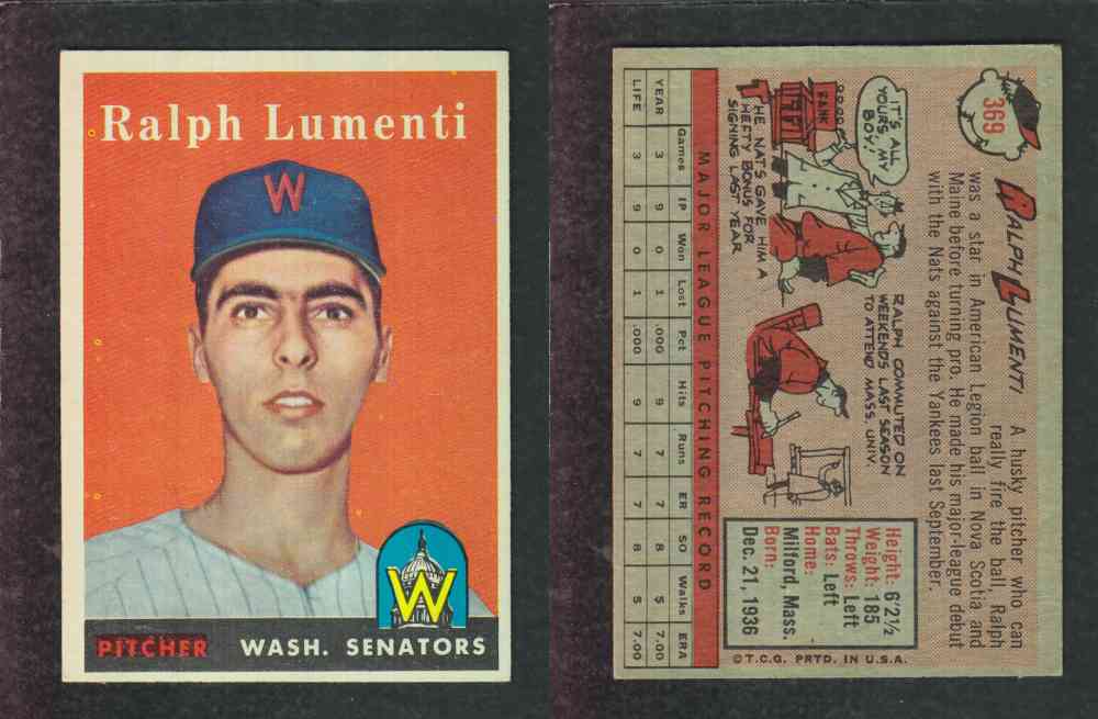 ITEM# : CS49106125 1958 TOPPS BASEBALL CARD #369 R. LUMENTI DESCRIPTION 1958 TOPPS BASEBALL CARD #369 R. LUMENTI CONDITION EX/MINT NO CREASE PRICE $2.99 USD SHIPPING CANADA RESIDENT 3.00$