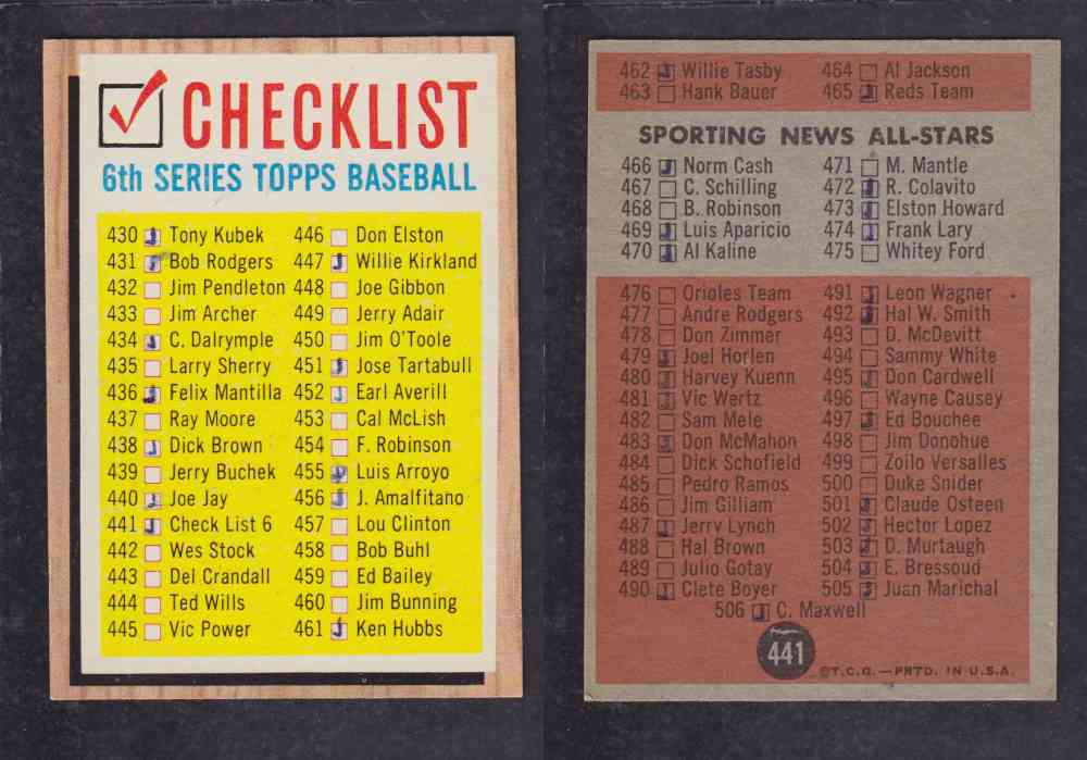 ITEM# : CS49779128 1962 TOPPS BASEBALL CARD #441 CHECK LIST DESCRIPTION 1962 TOPPS BASEBALL CARD #441 CHECK LIST CONDITION VG 1 SMALL CREASE PRICE $1.99 USD SHIPPING CANADA RESIDENT 3.00$