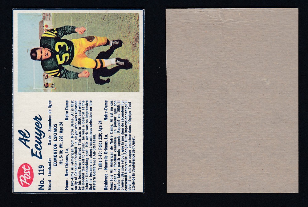 ITEM# : CS50102856 1962 CFL POST FOOTBALL CARD #119 A. ECUYER DESCRIPTION 1962 CFL POST FOOTBALL CARD #119 A. ECUYER CONDITION HAND CUT PRICE $14.99 USD SHIPPING CANADA RESIDENT 3.00$