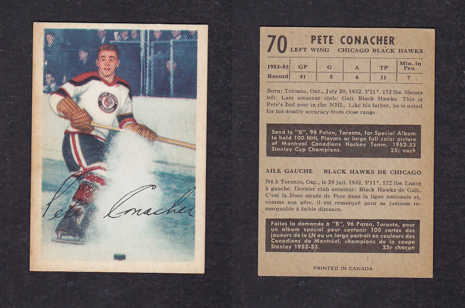 ITEM# : CS50253379 1953-54 PARKHURST HOCKEY CARD #70 P. CONACHER DESCRIPTION 1953-54 PARKHURST HOCKEY CARD #70 P. CONACHER CONDITION EX+ NO CREASE PRICE $19.99 USD SHIPPING CANADA RESIDENT 3.00$