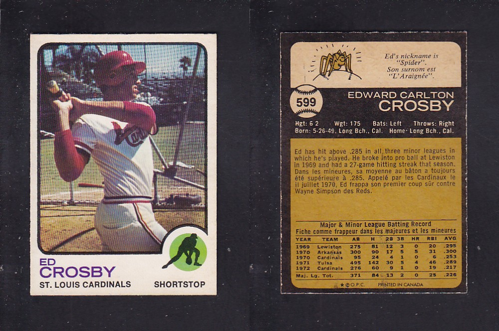 ITEM# : CS50899596 1973 O-PEE-CHEE BASEBALL CARD #599 E. CROSBY DESCRIPTION 1973 O-PEE-CHEE BASEBALL CARD #599 E. CROSBY CONDITION NRMINT NO CREASE PRICE $4.99 USD SHIPPING CANADA RESIDENT 3.00$