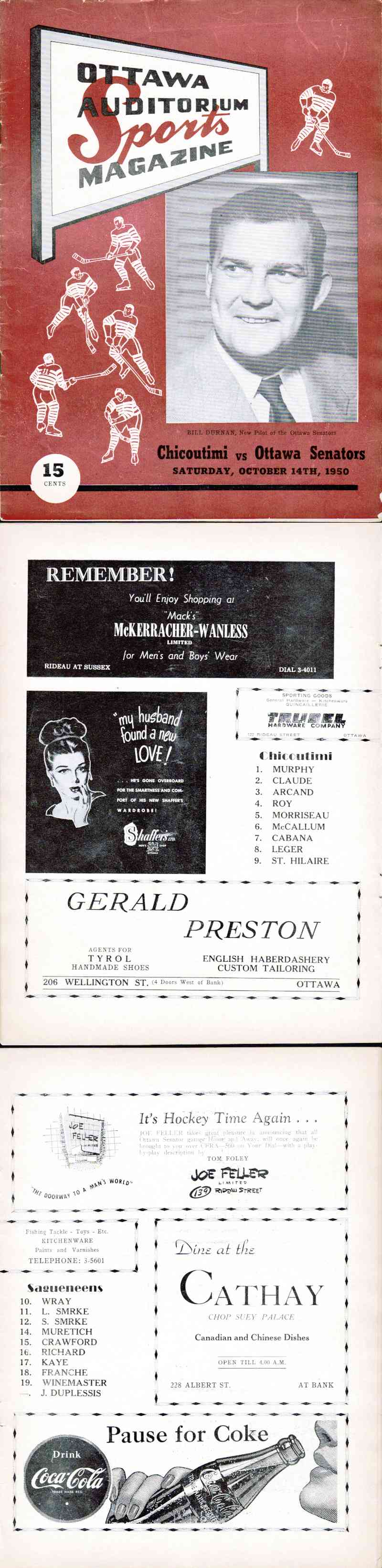1950 OTTAWA SENATORS VS CHICOUTIMI SAGUENEENS PROGRAM