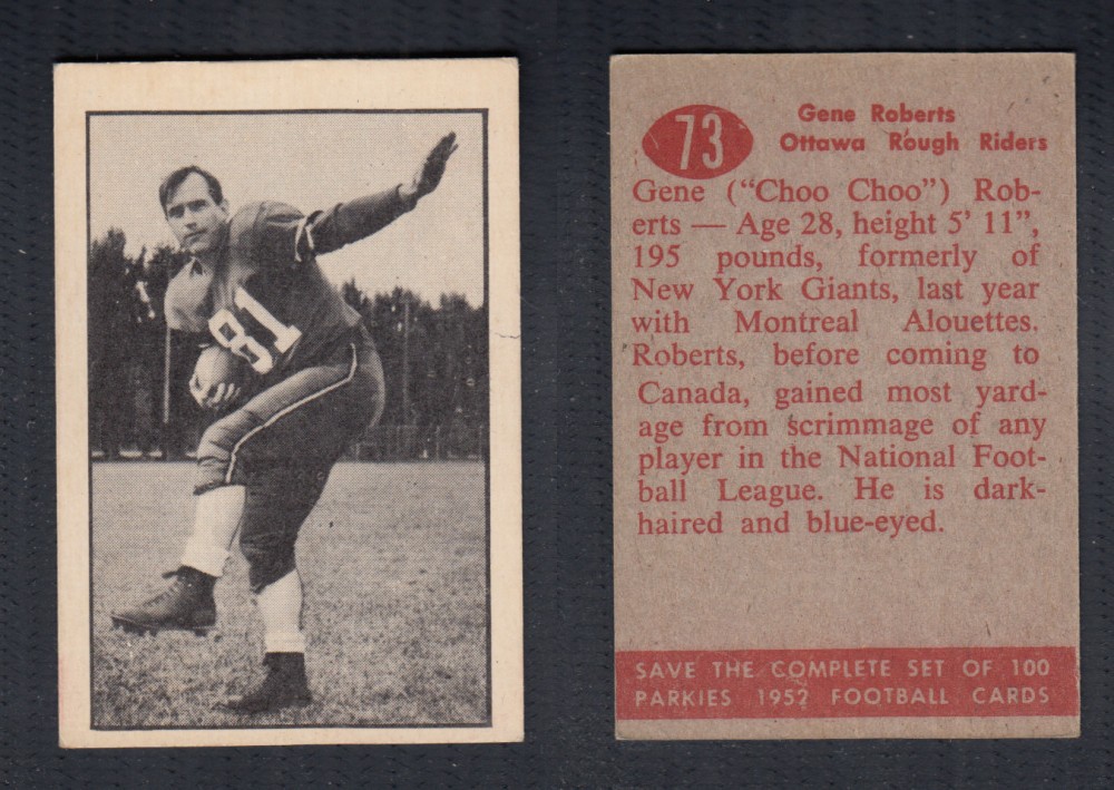 ITEM# : CS51974799 1952 CFL PARKHURST FOOTBALL CARD #73 G. ROBERTS DESCRIPTION 1952 CFL PARKHURST FOOTBALL CARD #73 G. ROBERTS CONDITION EX