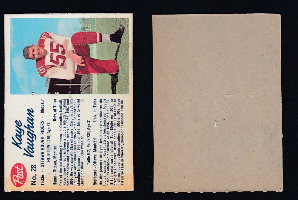 ITEM# : CS52005334 1962 CFL POST FOOTBALL CARD #28 K. VAUGHAN DESCRIPTION 1962 CFL POST FOOTBALL CARD #28 K. VAUGHAN CONDITION HAND CUT PRICE $24.99 USD SHIPPING CANADA RESIDENT 3.00$