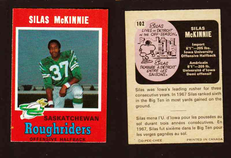 ITEM# : CS53058762 1971 CFL O-PEE-CHEE FOOTBALL CARD #102 S. McKINNIE DESCRIPTION 1971 CFL O-PEE-CHEE FOOTBALL CARD #102 S. McKINNIE CONDITION EX/MINT NO CREASE PRICE $4.99 USD SHIPPING CANADA RESIDENT $3.00