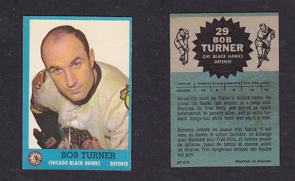 ITEM# : CS53090596 1962-63 TOPPS HOCKEY CARD #29 B. TURNER DESCRIPTION 1962-63 TOPPS HOCKEY CARD #29 B. TURNER CONDITION NRMINT NO CREASE PRICE $9.99 USD SHIPPING CANADA RESIDENT 3.00$
