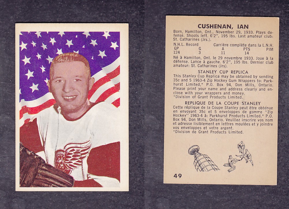ITEM# : CS53413063 1963-64 PARKHURST HOCKEY CARD #49 I. CUSHENAN DESCRIPTION 1963-64 PARKHURST HOCKEY CARD #49 I. CUSHENAN CONDITION NRMINT NO CREASE PRICE $11.99 USD SHIPPING CANADA RESIDENT 3.00$