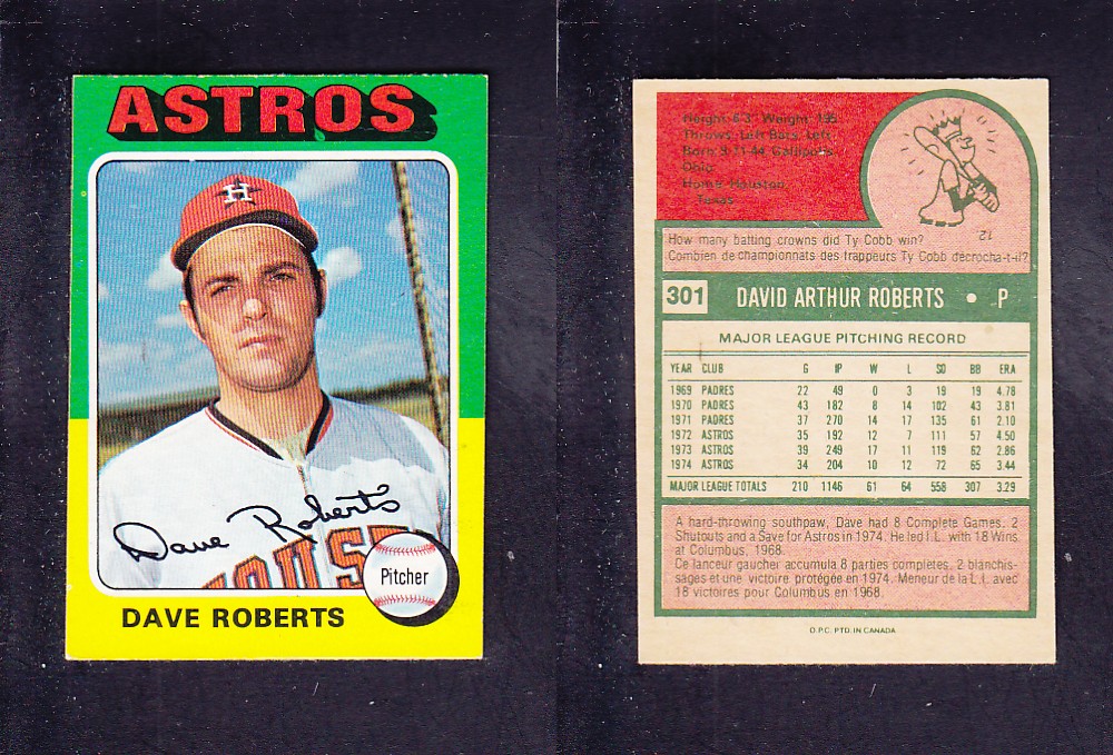 ITEM# : CS54866854 1975 O-PEE-CHEE BASEBALL CARD #301 D. ROBERTS DESCRIPTION 1975 O-PEE-CHEE BASEBALL CARD #301 D. ROBERTS CONDITION EX/MINT NO CREASE PRICE $2.99 USD SHIPPING CANADA RESIDENT 3.00$