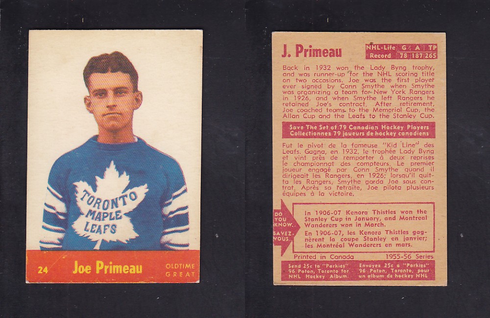ITEM# : CS55775405 1955-56 PARKHURST HOCKEY CARD #24 J. PRIMEAU DESCRIPTION 1955-56 PARKHURST HOCKEY CARD #24 J. PRIMEAU CONDITION EX+ NO CREASE PRICE $39.99 USD SHIPPING CANADA RESIDENT 3.00$