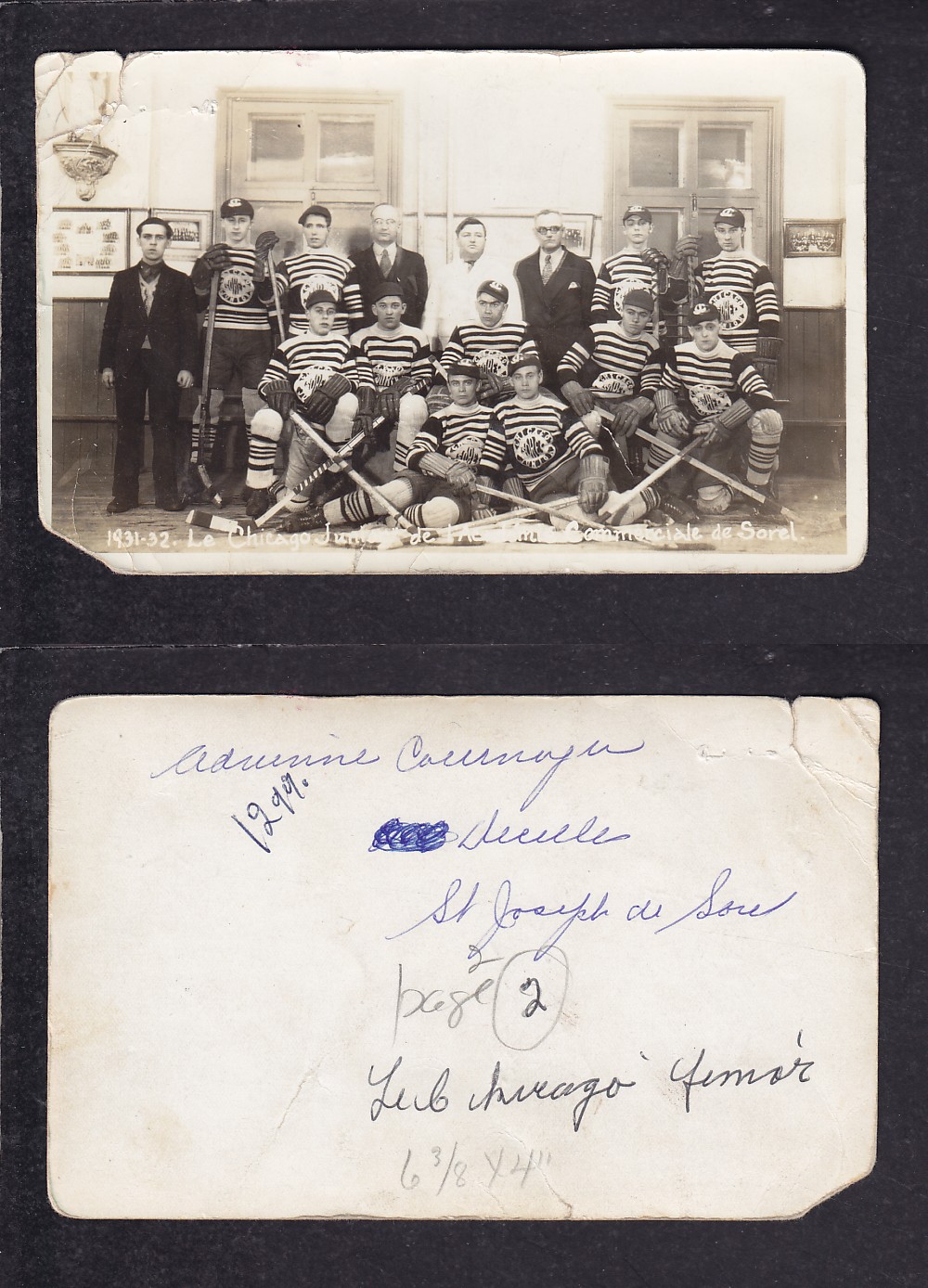 ITEM# : CS55954160 1931-32 SOREL HOCKEY TEAM POST CARD DESCRIPTION 1931-32 SOREL HOCKEY TEAM POST CARD CONDITION GOOD PRICE $49.99 USD SHIPPING CANADA RESIDENT 3.00$