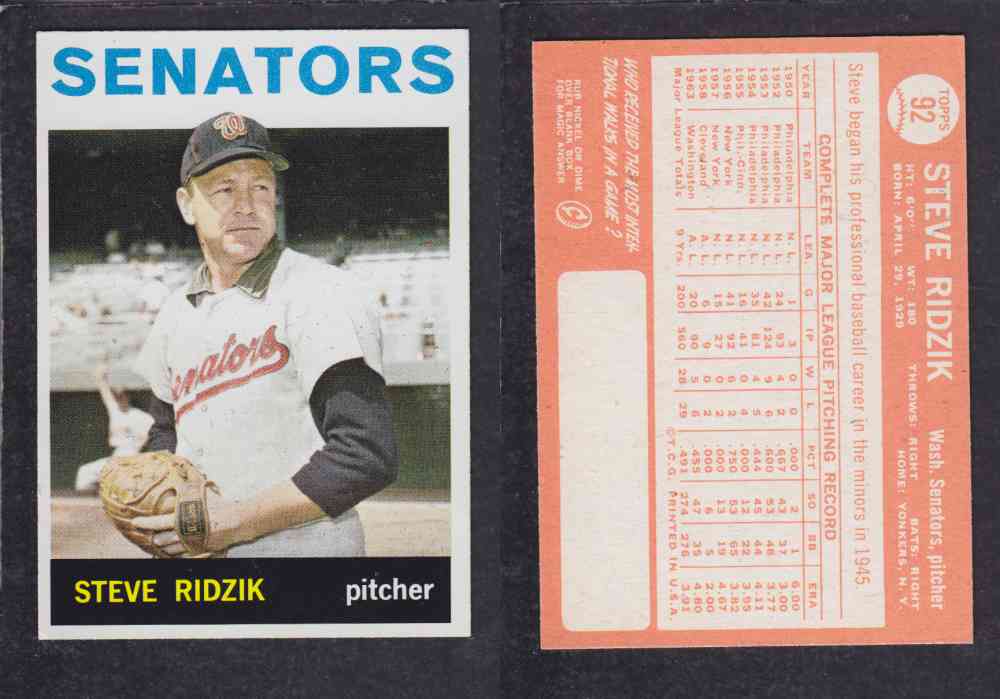 ITEM# : CS56537694 1964 TOPPS BASEBALL CARD #92 S. RIDZIK DESCRIPTION 1964 TOPPS BASEBALL CARD #92 S. RIDZIK CONDITION EX+ NO CREASE PRICE $1.99 USD SHIPPING CANADA RESIDENT 3.00$