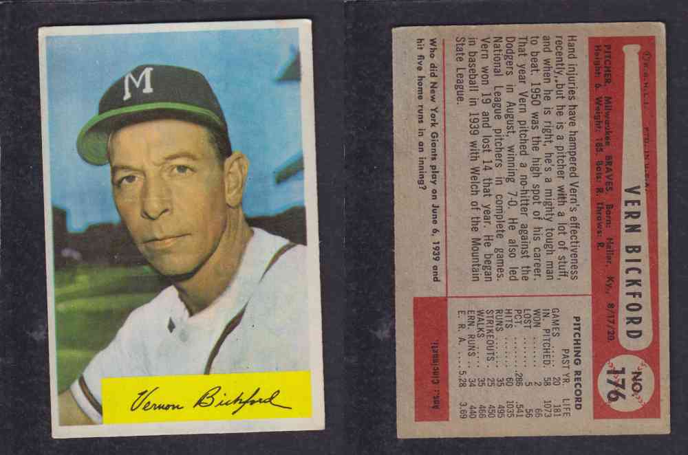 ITEM# : CS57755722 1954 BOWMAN BASEBALL CARD #176 V. BICKFORD DESCRIPTION 1955 BOWMAN BASEBALL CARD #176 V. BICKFORD CONDITION EX NO CREASE PRICE $2.99 USD SHIPPING CANADA RESIDENT 3.00$