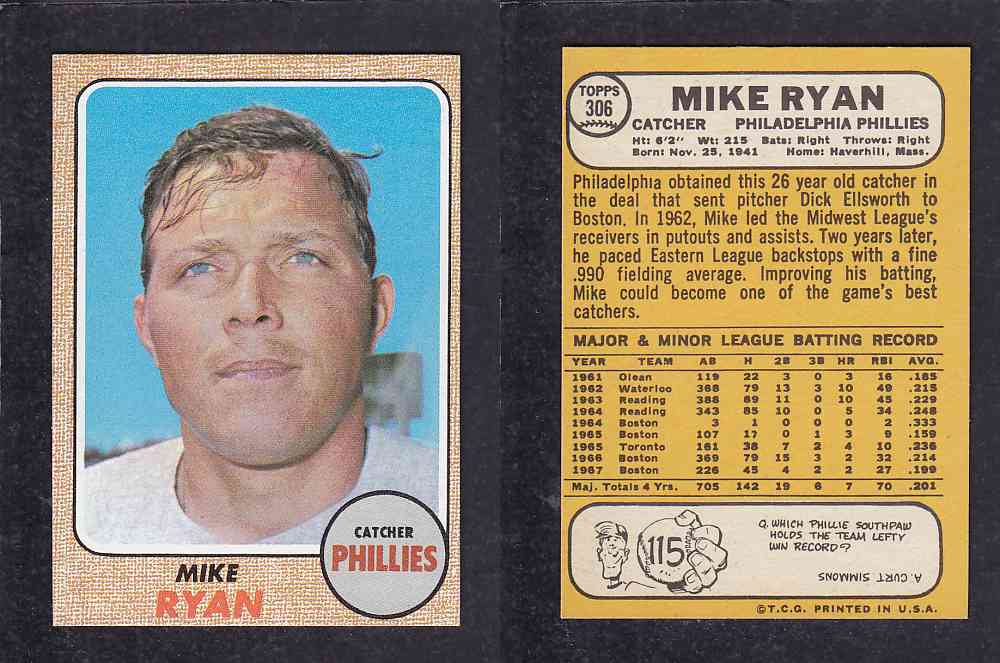 ITEM# : CS58753171 1968 TOPPS BASEBALL CARD #306 M. RYAN DESCRIPTION 1968 TOPPS BASEBALL CARD #306 M. RYAN CONDITION NRMINT NO CREASE PRICE $1.99 USD SHIPPING CANADA RESIDENT 3.00$
